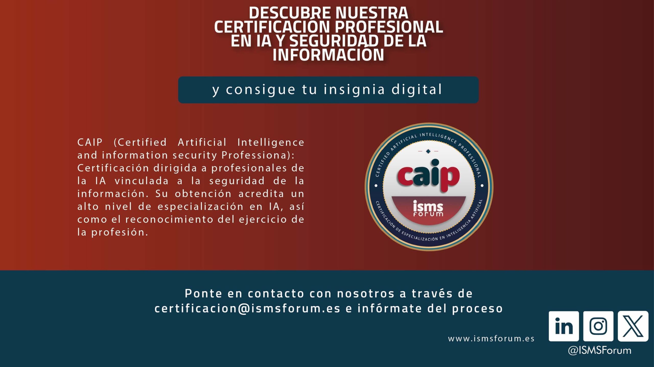 ¡Conviértete en profesional en la IA en la seguridad de la información y avanza en tu carrera con la certificación CAIP! La Certified Artificial Intelligence and information security Professional (CAIP) es la certificación impulsada por ISMS Forum para profesionales que trabajan con IA en el ámbito de la seguridad de la información. Obtenerla acredita un alto nivel de especialización y reconocimiento en el ejercicio de la profesión.