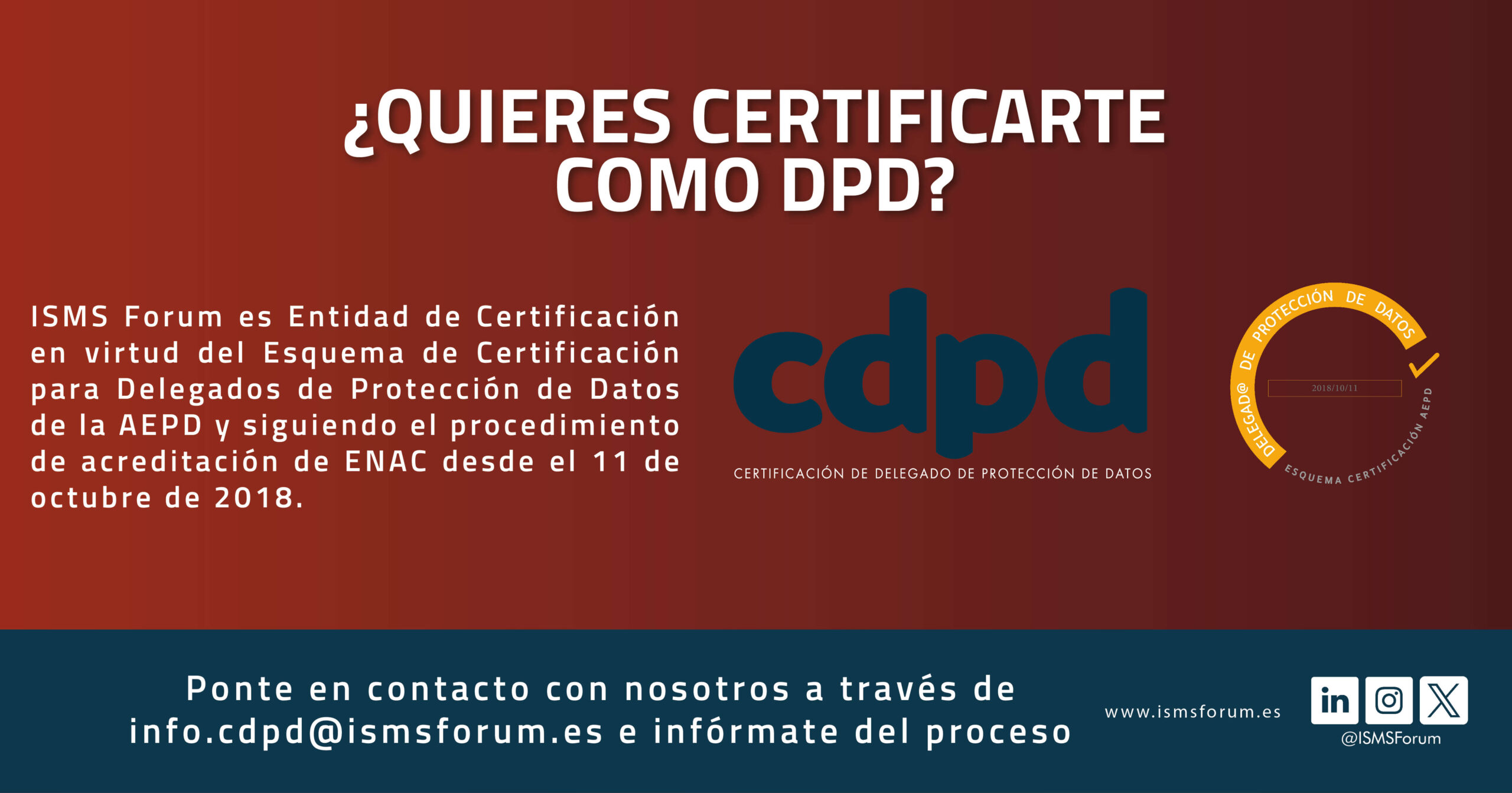 ¡Cumple tus propósitos de año nuevo y consolida tu carrera como DPD en 2025! ISMS Forum, en su compromiso con la comunidad de expertos en protección de datos, se constituye como Entidad de Certificación desde el 11 de octubre de 2018 en virtud del Esquema de Certificación para DPD impulsado por la AEPD y siguiendo la norma ISO/IEC 17024/2012 bajo la acreditación de ENAC.