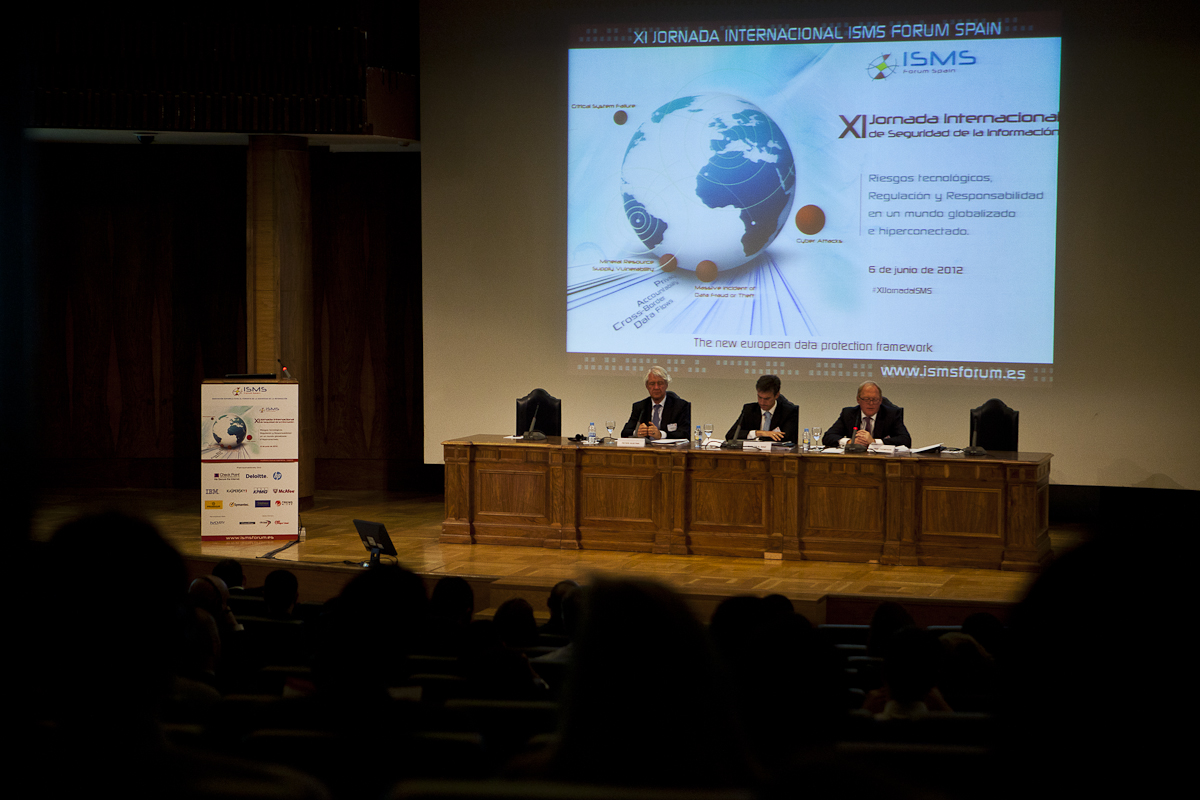 Imagen de la primera mesa redonda de la jornada, en la que participaron el Supervisor Europeo de Protección de Datos, Peter Hustinx, y el Director de Seguridad de la Información de KPMG, George Thompson, moderada por el Vicepresidente de ISMS Forum, Carlos Alberto Saiz.