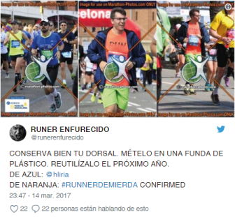 A parte, también destaca el trabajo de tuiteros como Arros Running, que lleva desde hace años analizando todo tipo de datos que ofrecen las carreras, al igual que imágenes o tiempos. Así, consiguió, por ejemplo, desenmascarar a muchos de los tramposos que hicieron el Maratón de Madrid 2017.