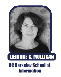 Deirdre K. Mulligan es profesora Asociada en la Escuela de Información de UC Berkeley, directora de la facultad del Centro de Derecho y Tecnología de Berkeley, y afiliada en el Centro de Berkeley para Ciberseguridad de Largo Plazo de Hewlett. La investigación de Mulligan explora los medios legales y técnicos para proteger valores como la privacidad, la libertad de expresión y la equidad en los sistemas técnicos emergentes. Su libro, Privacy on the ground: Privacy on the Ground: Driving Corporate Behavior in the United States and Europe, un estudio de prácticas de privacidad en grandes corporaciones de cinco países y realizado con el profesor de derecho de UC Berkeley, Kenneth Bamberger, fue publicado recientemente por MIT Press. Mulligan y Bamberger recibieron el Premio de Liderazgo de la Asociación Internacional de Profesionales de la Privacidad 2016 por sus contribuciones de investigación en el campo de la protección de la privacidad.