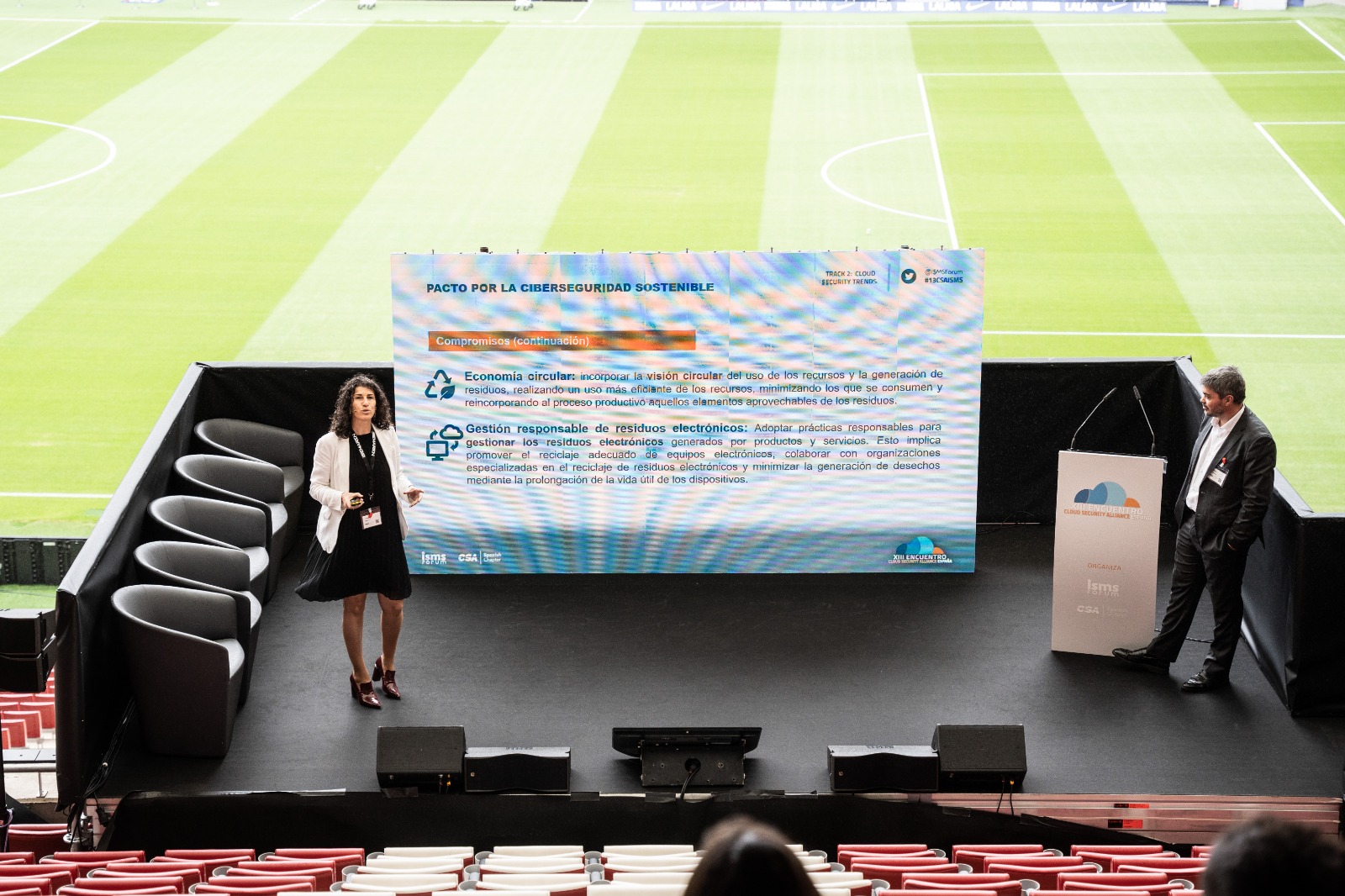Uno de los proyectos más destacados que los asistentes pudieron conocer fue ‘Green Cloud & Pacto por Ciberseguridad Sostenible’, iniciativa impulsada desde un grupo de trabajo de ISMS Forum, presentada en la jornada por Josep Bardallo, Director de TI & CISO del Grupo Hospitalario Recoletas, y Helena Fernández, Sustainable and Climate Change Manager de ISEMAREN.