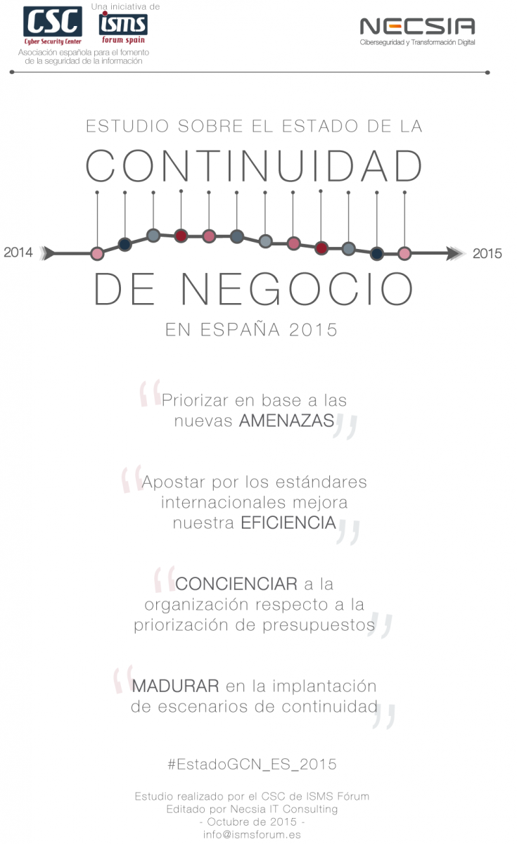 El pasado mes de septiembre, el Centro de Estudios en Ciberseguridad de ISMS Forum, realizó una encuesta en colaboración con Necsia sobre el “Estado de la Continuidad de Negocio”, con un doble objetivo: dar a conocer la situación actual de las empresas españolas en materia de Gestión de la Continuidad de Negocio y determinar próximas acciones que permitan mejorar el estado del mismo. Más de 60 empresas participaron en la encuesta.