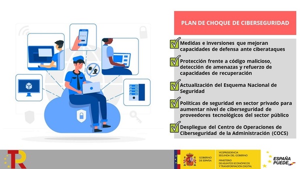 Entre las medidas que incluye este plan de choque figuran la protección frente al código malicioso (especialmente del tipo orientado a la destrucción de la información mediante su cifrado), la extensión de los servicios para la detección de ciberamenazas en equipos de usuario, la implantación de la vigilancia de accesos remotos, el refuerzo de las capacidades de búsqueda de amenazas, la ampliación de las capacidades de ciberinteligencia, la extensión de la aplicación del uso del segundo factor en los procesos de identificación y autenticación, el despliegue de capacidades para la notificación y el seguimiento de los ciberincidentes, la continuidad de negocio y la recuperación ante desastres, la concienciación y la formación, y la revisión de la normativa de ciberseguridad.