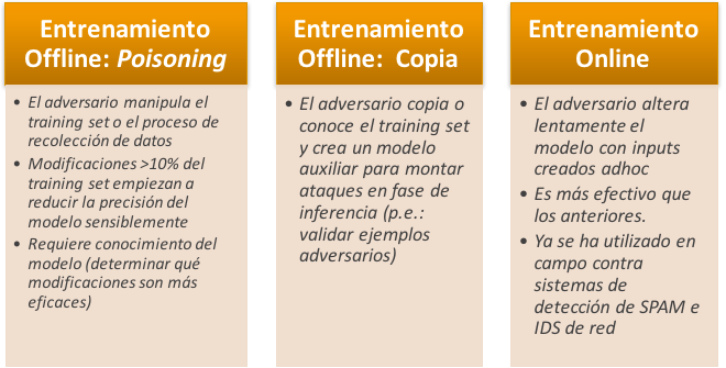 A pesar de su cada vez más extendido uso, la inmensa mayoría los sistemas basados en ML se han desarrollado con un modelo de amenazas muy débil y nada realista, en el que las condiciones normales de funcionamiento suponen la ausencia de adversarios. Esto convierte a estos sistemas en vulnerables a diferentes tipos de ataques, tal como se ha documentado en múltiples artículos de investigación, existiendo además evidencia de que varios de estos ataques se han puesto en práctica ya con éxito en campo.
