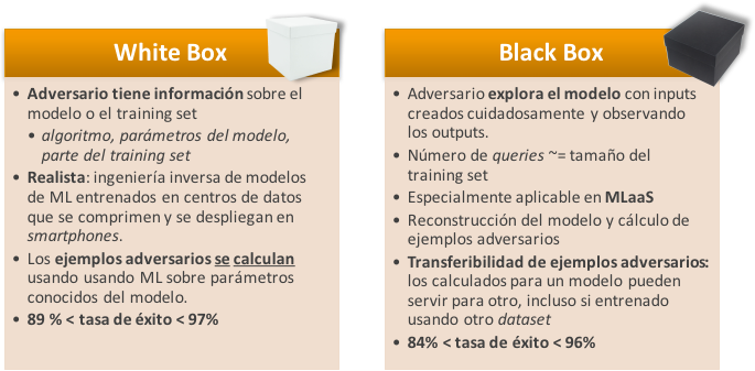 Cuando el atacante tiene algún conocimiento del modelo de ML que quiere atacar, hablaremos de ataques White Box. Este tipo de ataques son totalmente realistas, bien porque el atacante obtiene inteligencia sobre el modelo empleando algún otro ciberataque previo (ver los ataques de copia durante la fase de entrenamiento offline del modelo) o bien porque se empleen técnicas de ingeniería inversa sobre el modelo de ML, que son posibles porque en muchas ocasiones los algoritmos de ML entrenados en algún potente data center en algún lugar del mundo, se comprimen y se descargan a los dispositivos (por ejemplo smartphones) donde se ejecutará el software que hace uso de ellos.