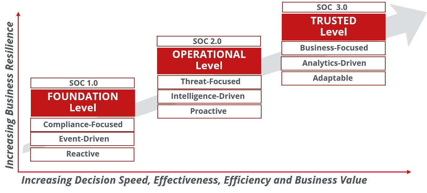 Podemos ver cómo el nivel de madurez de un cliente respecto a sus Operaciones de Seguridad (SecOps), puede representarse, en general, con este modelo de tres niveles: