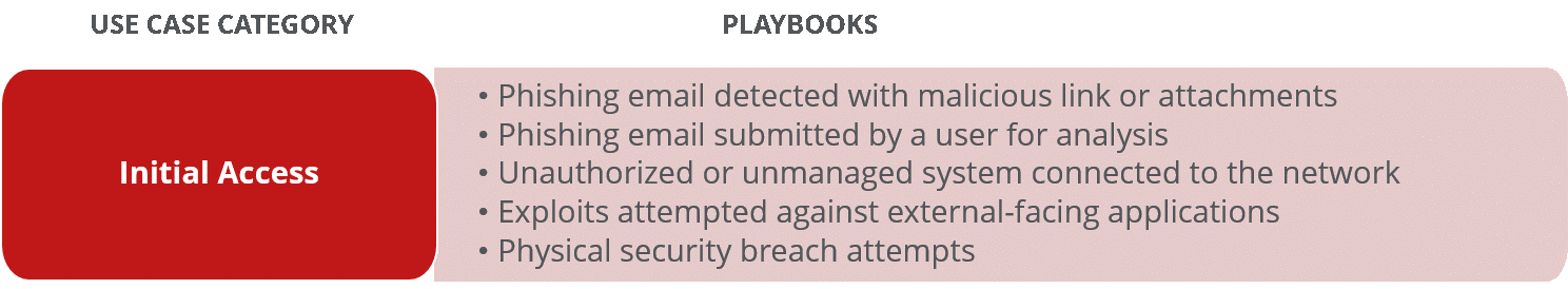 Un SOC debe ser capaz de priorizar el caso de uso y el desarrollo posterior del manual de estrategia, basándose en mitigar los riesgos más críticos para el negocio. Por lo general, esto comienza con la identificación de las «joyas de la corona», aquellos sistemas o datos que, si se comprometen, tendrán un impacto adverso en el negocio. La siguiente figura proporciona un ejemplo de algunos “playbooks” potenciales dentro de este caso de uso: