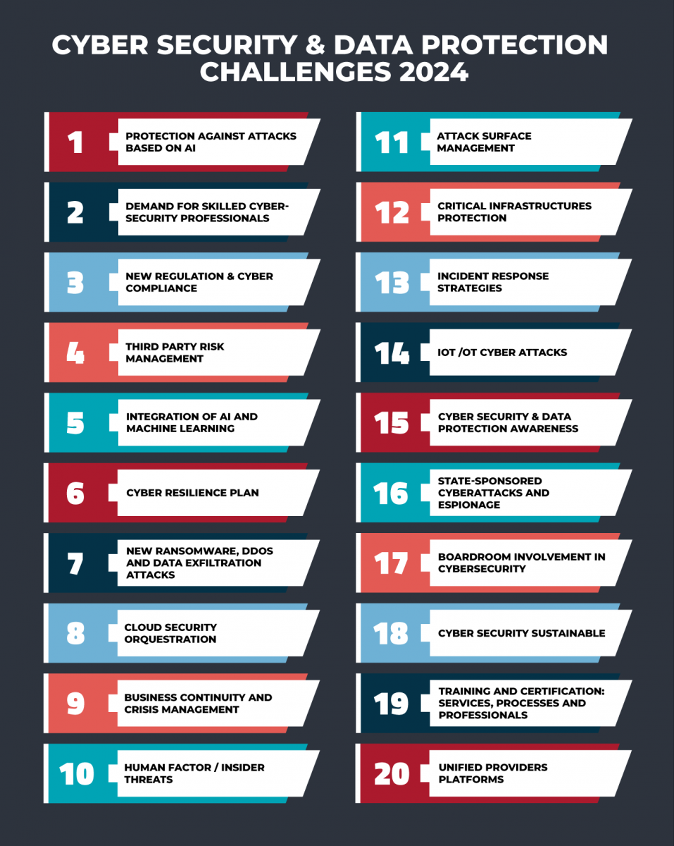 Hemos elaborado una relación de 20 temáticas que en este 2024 ocuparán el foco de las áreas de seguridad de la información y de gobierno TI de las organizaciones, siendo las que más preocupan las que ocupan los primeros puestos. Encabezan la lista la protección contra los ataques basados en la Inteligencia Artificial, la demanda de profesionales cualificados y cyber compliance, entre otros.